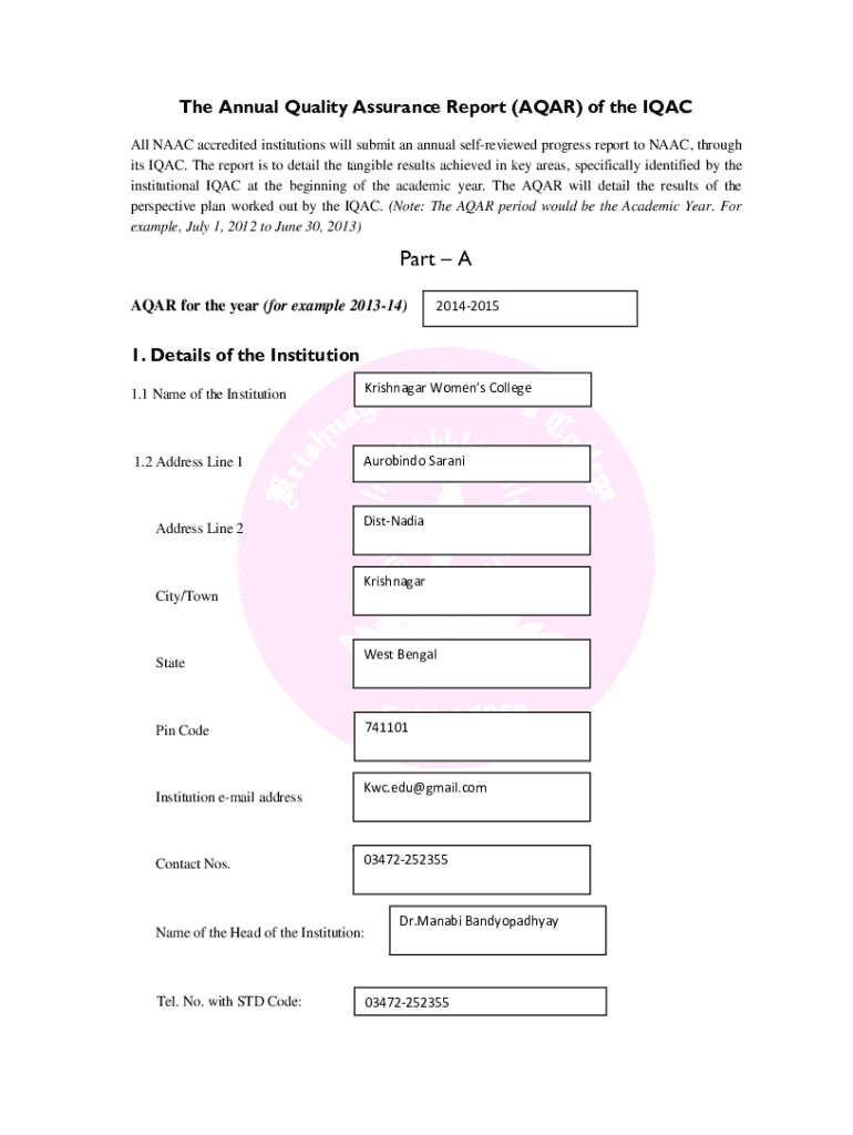 The Annual Quality Assurance Report (AQAR) of the IQAC All NAAC accredited institutions will submit an annual selfreviewed progress report to NAAC, through its IQAC. The report is to detail the tangible results achieved in key areas, specifically identified by the institutional IQAC at the beginning of the academic year. The AQAR will detail the results of the perspective plan worked out by the IQAC. (Note: The AQAR period would be the Academic Year. For example, July 1, 2012 to June 30,...