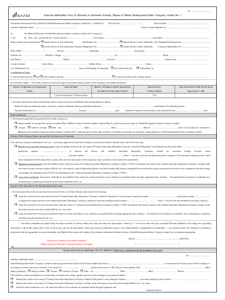 No. ....................................Exercise Notification Form of Warrants to Purchase Ordinary Shares of SAAM Development Public Company Limited No. 1 Warrants to Purchase Ordinary Shares of