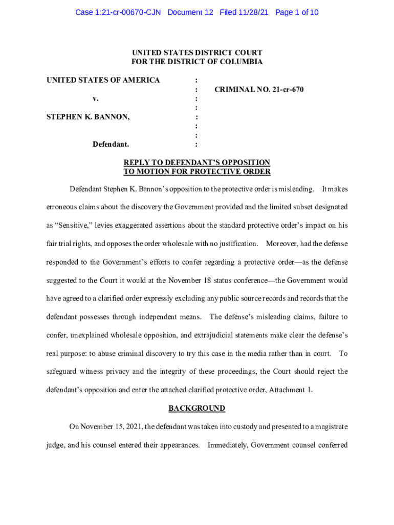 Case 1:21cr00670CJN Document 12 Filed 11/28/21 Page 1 of 10UNITED STATES DISTRICT COURT FOR THE DISTRICT OF COLUMBIA UNITED STATES OF AMERICA v. STEPHEN K. BANNON, Defendant.: : : : : : : :CRIMINAL NO. 21cr670REPLY TO DEFENDANTS OPPOSITION TO MOTION FOR PROTECTIVE ORDER Defendant Stephen K. Bannons opposition to the protective order is misleading. It makes erroneous claims about the discovery the Government provided and the limited subset designated as Sensitive, levies exaggerated