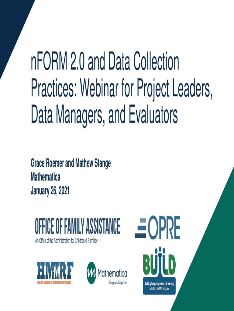 nFORM 2.0 and Data Collection Practices: Webinar for Project Leaders, Data Managers, and Evaluators Grace Roemer and Mathew Stange Mathematica January 26, 2021Todays speakersGrace RoemerMathew StangeMathematicaMathematicaTodays agenda Data collection overview Introduction to nFORM 2.0 Getting organized to collect data Enrolling clients and managing client profiles Administering client surveys Recording participation data Monitoring data collection Training