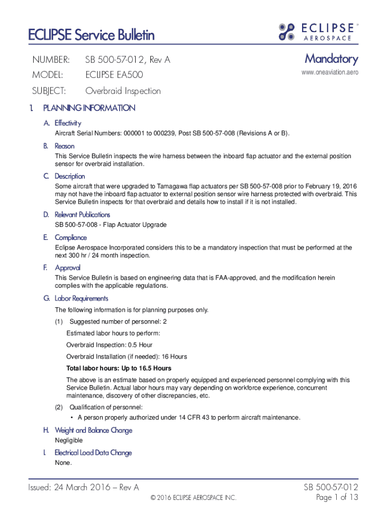 ECLIPSE Service Bulletin NUMBER:SB 50057012, Rev AMODEL:ECLIPSE EA500SUBJECT:Overbraid Inspection1.Mandatory www.oneaviation.aeroPLANNING INFORMATION A. Effectivity Aircraft Serial Numbers: 000001