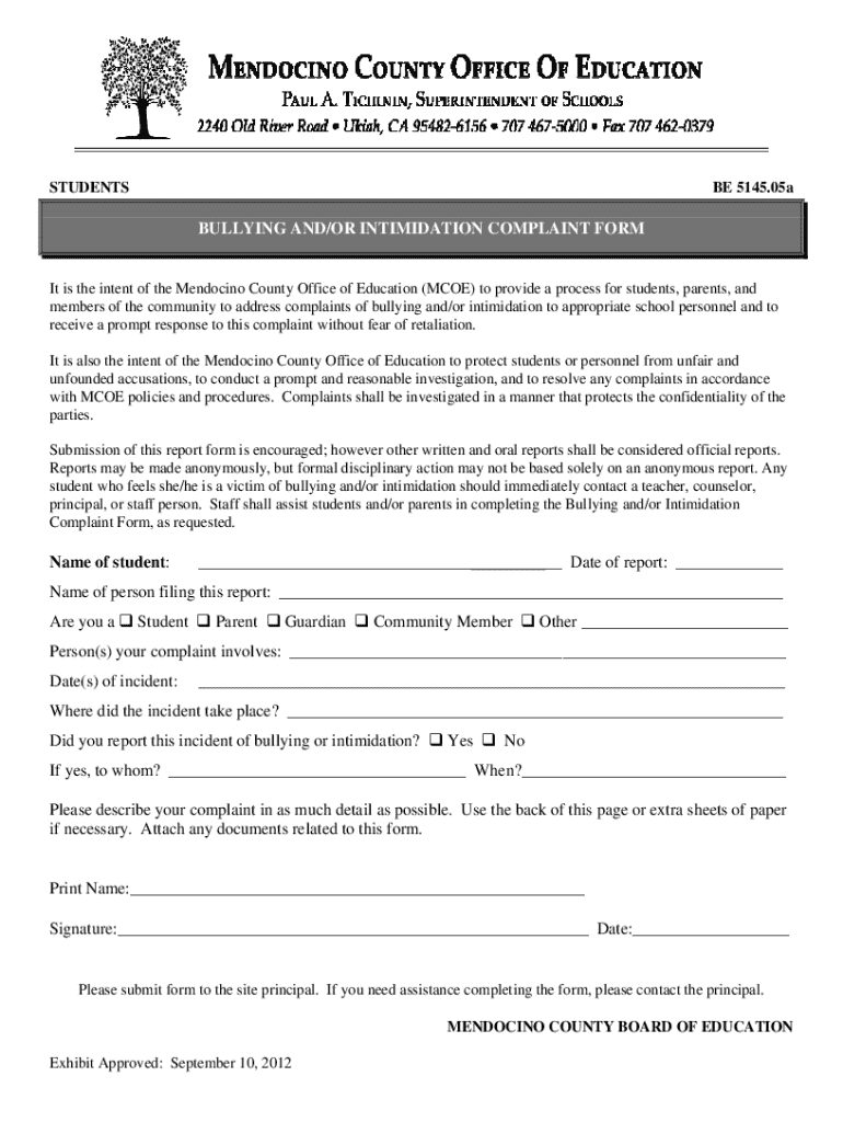 STUDENTSBE 5145.05aBULLYING AND/OR INTIMIDATION COMPLAINT FORMIt is the intent of the Mendocino County Office of Education (MCOE) to provide a process for students, parents, and members of the community to address complaints of bullying and/or intimidation to appropriate school personnel and to receive a prompt response to this complaint without fear of retaliation. It is also the intent of the Mendocino County Office of Education to protect students or personnel from unfair and unfounded...