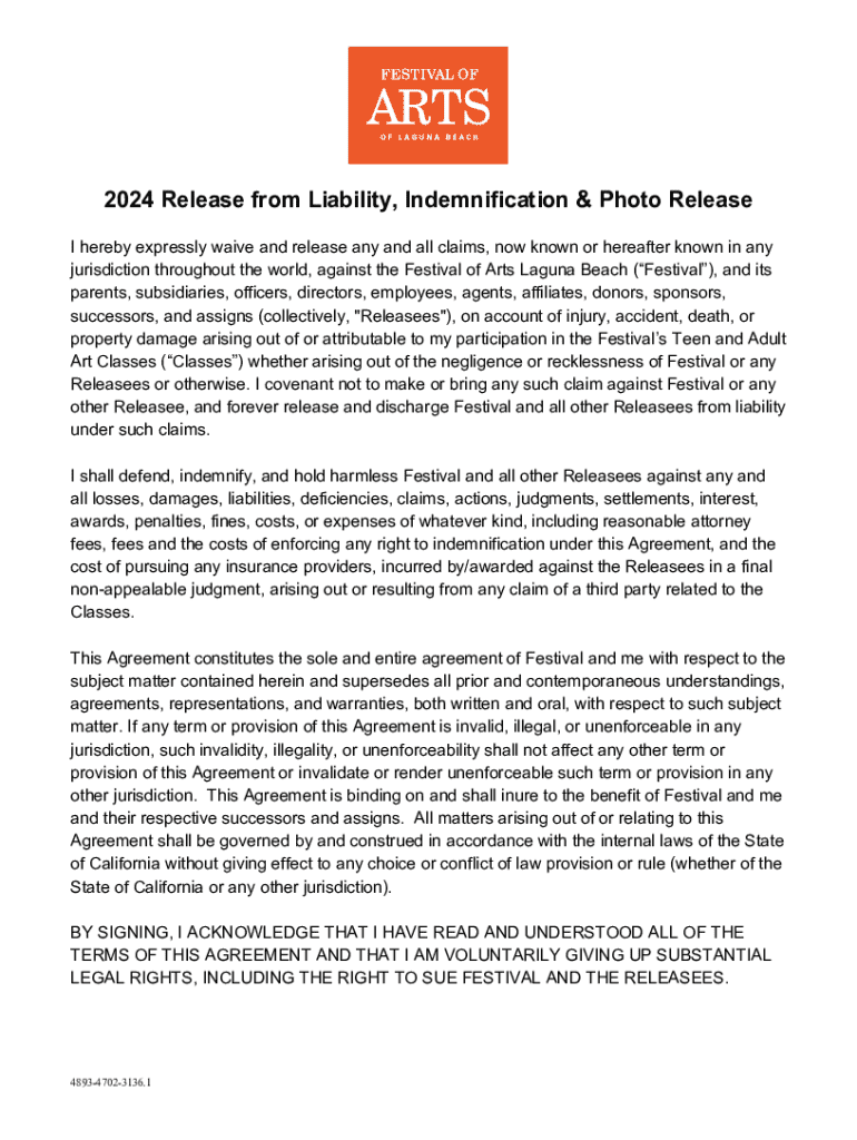 2024 Release from Liability, Indemnification & Photo Release I hereby expressly waive and release any and all claims, now known or hereafter known in any jurisdiction throughout the world, against