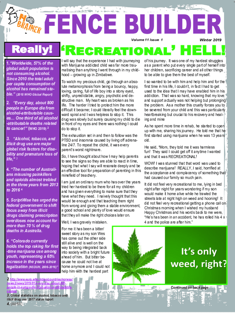 Really!Volume 11 Issue 1Winter 2019Recreational HELL! I will say that the experience I had with journeying with Marijuana addicted child was far more traumatising than anything I went through in my childhood growing up in Zimbabwe.of his journey. It was one of my hardest struggles as a parent who put every single part of herself into her children, sacrificing career and all other things to be able to give them the best of myself.To watch my precious child, go through an absolute