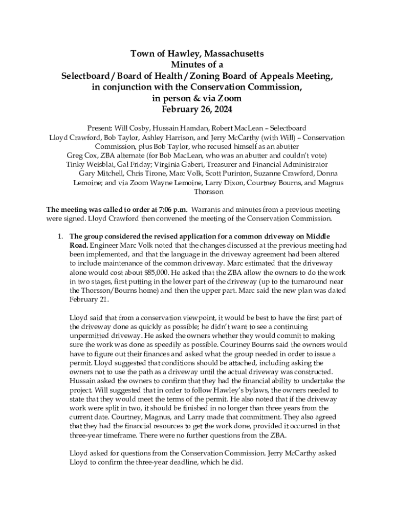 Town of Hawley, Massachusetts Minutes of a Selectboard / Board of Health / Zoning Board of Appeals Meeting, in conjunction with the Conservation Commission, in person & via Zoom February 26, 2024