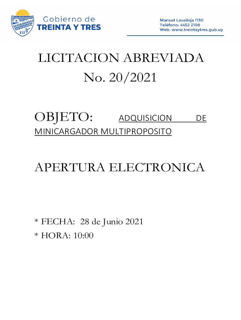 LICITACION ABREVIADA No. 20/2021OBJETO:ADQUISICION MINICARGADOR MULTIPROPOSITODEAPERTURA ELECTRONICA* FECHA: 28 de Junio 2021 * HORA: 10:00PLIEGO DE CONDICIONES PARTICULARES ARTICULO 1 OBJETO La Intendencia