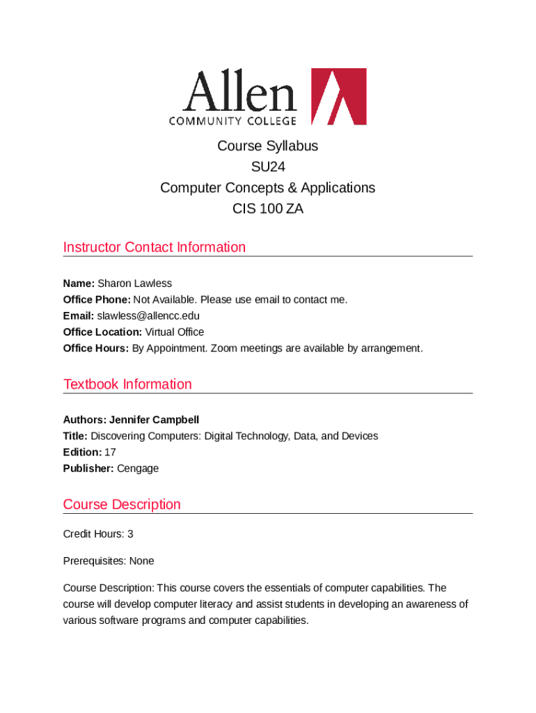 Course Syllabus SU24 Computer Concepts & Applications CIS 100 ZA Instructor Contact Information Name: Sharon Lawless Office Phone: Not Available. Please use email to contact me. Email: slawless@allencc.edu