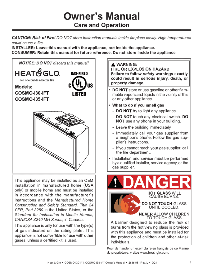 Owners Manual Care and OperationCAUTION! Risk of Fire! DO NOT store instruction manuals inside fireplace cavity. High temperatures could cause a fire. INSTALLER: Leave this manual with the appliance, not inside the appliance. CONSUMER: Retain this manual for future reference. Do not store inside the appliance NOTICE: DO NOT discard this manual!Models: COSMOI30IFT COSMOI35IFTWARNING: FIRE OR EXPLOSION HAZARD Failure to follow safety warnings exactly could result in serious injury, death, or...