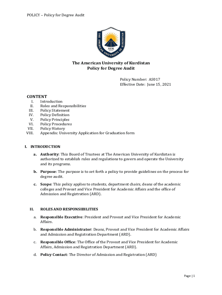 POLICY Policy for Degree Auditee American University of Kurdistan Policy for Degree Audit Policy Number: AS017 Effective Date: June 15, 2021CONTENTI. II. III. IV. V. VI. VII. VIII. Introduction Roles