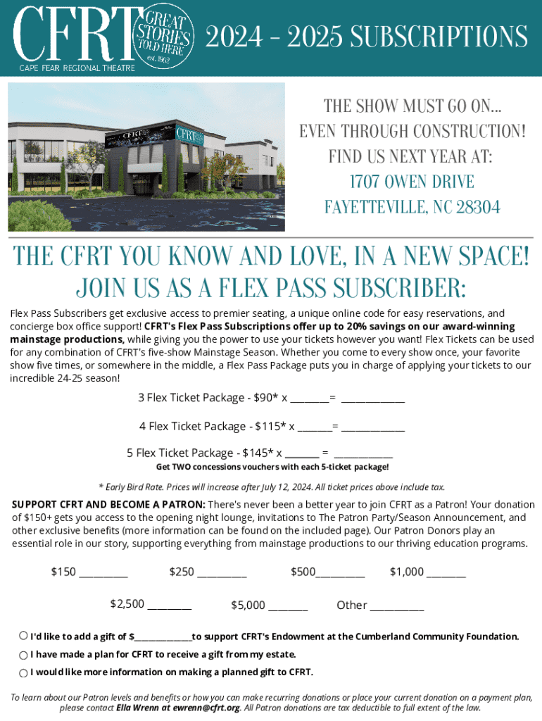 2024 2025 SUBSCRIPTIONS THE SHOW MUST GO ON... EVEN THROUGH CONSTRUCTION! FIND US NEXT YEAR AT: 1707 OWEN DRIVE FAYETTEVILLE, NC 28304THE CFRT YOU KNOW AND LOVE, IN A NEW SPACE! JOIN US AS A FLEX