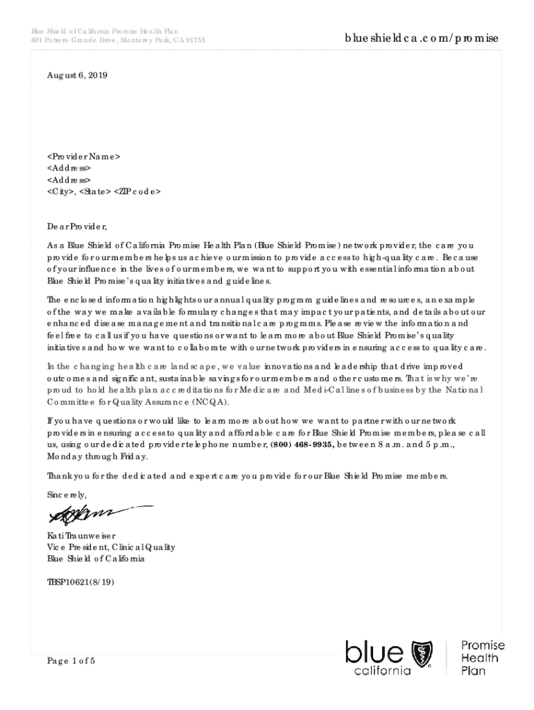 Blue Shield of California Promise Health Plan 601 Potrero Grande Drive, Monterey Park, CA 91755blueshieldca.com/promiseAugust 6, 2019Provider Name Address Address City, State ZIP codeDear Provider,