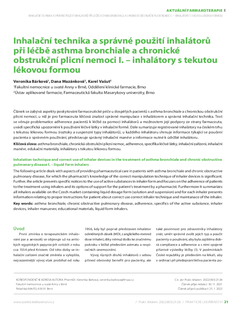AKTULN FARMAKOTERAPIE Inhalan technika a sprvn pouit inhaltor pi lb asthma bronchiale a chronick obstrukn plicn nemoci I. inhaltory s tekutou lkovou formouInhalan technika a sprvn pouit inhaltor pi