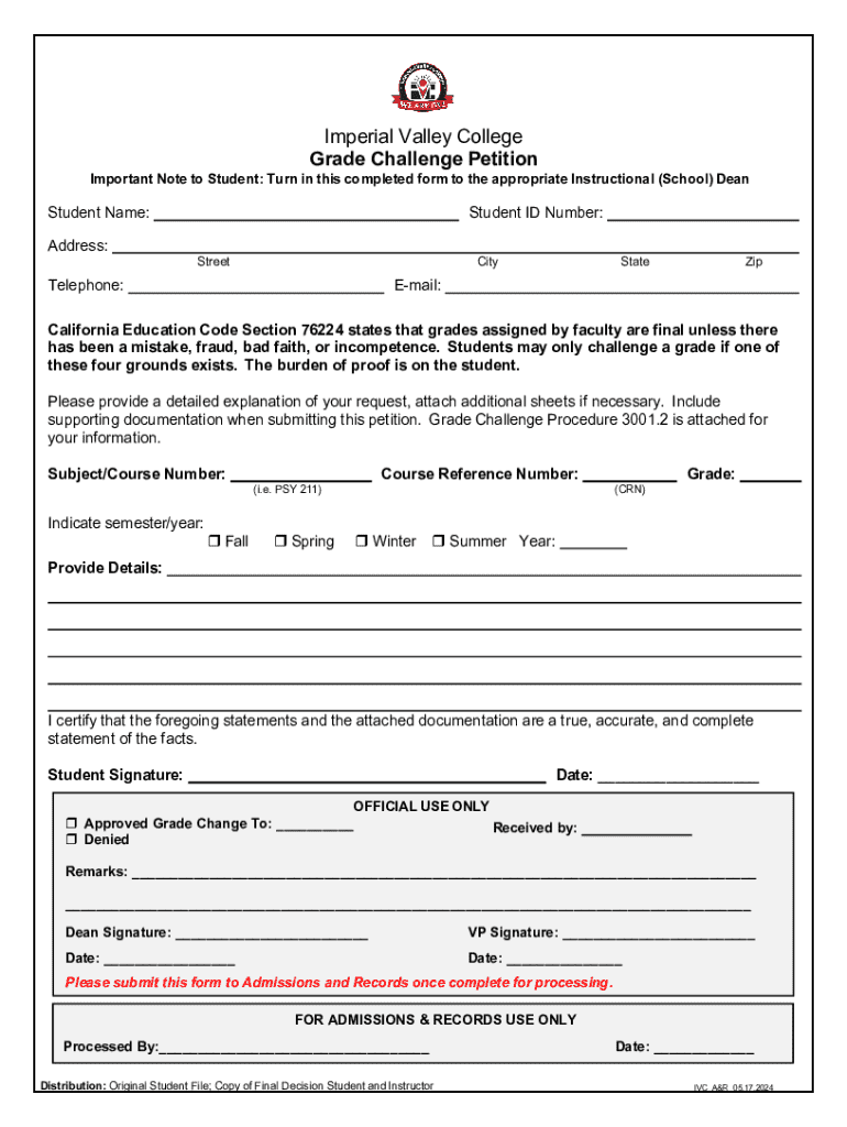 Imperial Valley College Grade Challenge PetitionImportant Note to Student: Turn in this completed form to the appropriate Instructional (School) DeanStudent Name: Address:Student ID Number: StreetCityTelephone:StateZipEmail:California