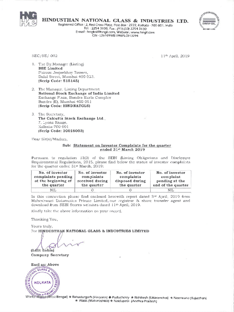 flaw Rig.HINDUSTHAN NATIONAL GLASS & INDUSTRIES LTD. RegisteredOffice2, Red Cross Place, Post Box : 2722, Kolkata Tel. : 2254 3100, Fax: (9]) (33) 2254 3I30 :Email:hngkol@hngil.com, CINSEC/SE/ I.TheWebsite:700