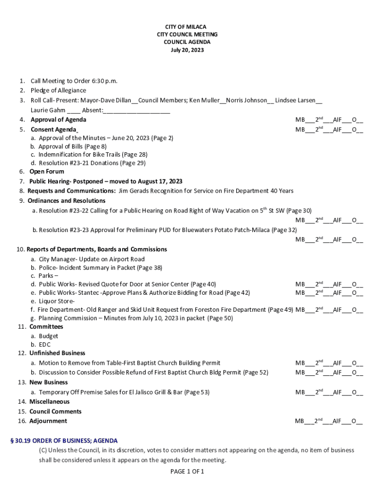 CITY OF MILACA CITY COUNCIL MEETING COUNCIL AGENDA July 20, 20231. Call Meeting to Order 6:30 p.m. 2. Pledge of Allegiance 3. Roll Call Present: MayorDave Dillan__Council Members; Ken Muller__Norris Johnson__ Lindsee Larsen__ Laurie Gahm ___ Absent:___ 4. Approval of Agenda MB___2nd___AIF___O__ 5. Consent Agenda MB___2nd___AIF___O__ a. Approval of the Minutes June 20, 2023 (Page 2) b. Approval of Bills (Page 8) c. Indemnification for Bike Trails (Page 28) d. Resolution #2321 Donations (Page...