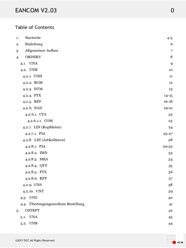 EANCOM V2.030Table of Contents 1.Startseite2.Einleitung63.Allgemeiner Aufbau74.ORDERS84.1. UNA94.2. UNB104.2.1. UNH114.2.2. BGM124.2.3. DTM134.2.4. FTX14154.2.5. RFF16184.2.6. NAD19214.2.6.1. CTA