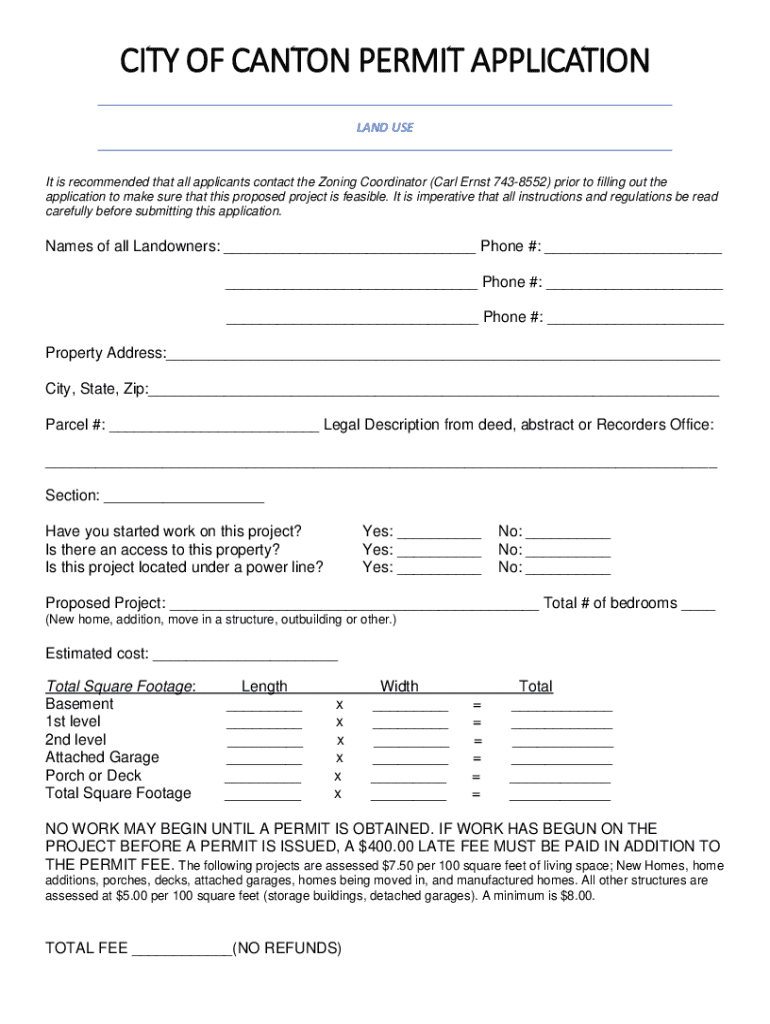 CITY OF CANTON PERMIT APPLICATION LAND USE It is recommended that all applicants contact the Zoning Coordinator (Carl Ernst 7438552) prior to filling out the application to make sure that this proposed