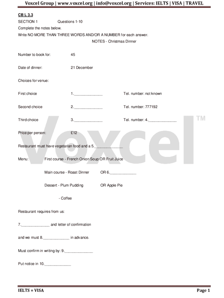Voxcel Group | www.voxcel.org | info@voxcel.org | Services: IELTS | VISA | TRAVEL CB L 3.3 SECTION 1Questions 110Complete the notes below. Write NO MORE THAN THREE WORDS AND/OR A NUMBER for each answer. NOTES Christmas DinnerNumber to book for:45Date of dinner:21 DecemberChoices for venue:First choice1.___Tel. number: not knownSecond choice2.___Tel. number: 777192Third choice3.___Tel. number: 4.___Price per person:12Restaurant must have vegetarian food and a 5
