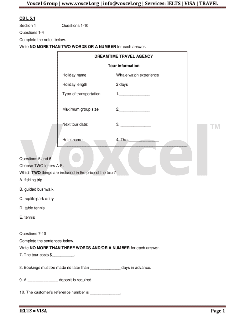 Voxel Group | www.voxcel.org | info@voxcel.org | Services: IELTS | VISA | TRAVEL CB L 5.1 Section 1Questions 110Questions 14 Complete the notes below. Write NO MORE THAN TWO WORDS OR A NUMBER for