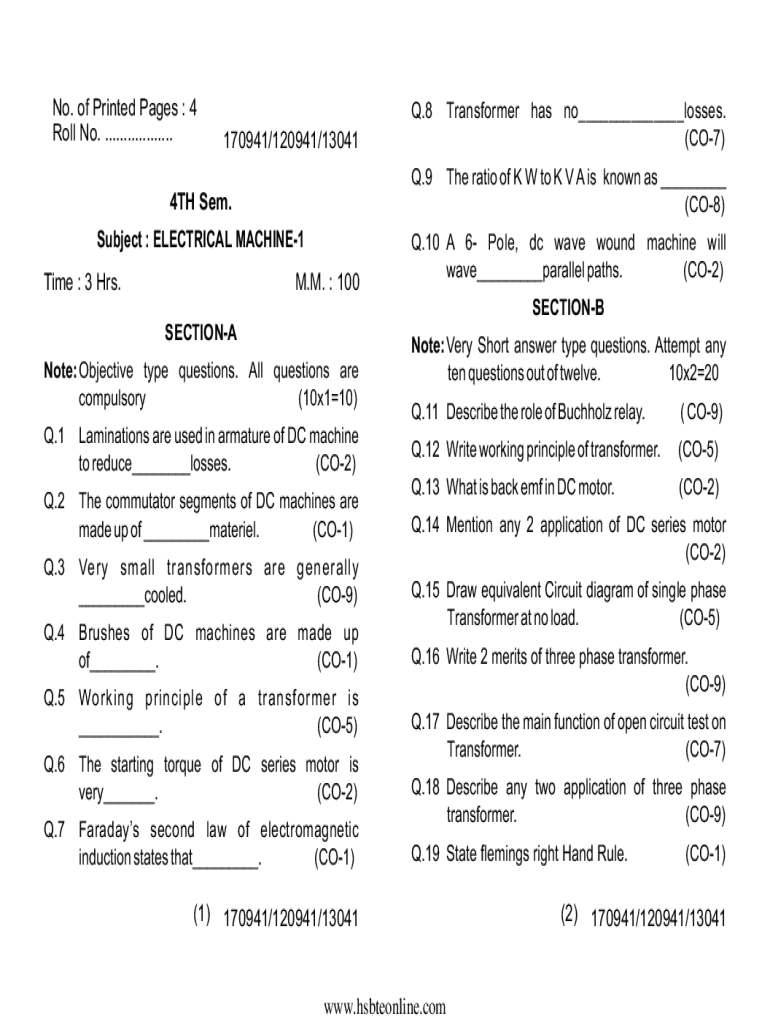 No. Of Printed Pages : 4 Roll No. .................. Q.8Transformer has no___losses. (CO7)Q.9The ratio of K W to K V A is known as ___ (CO8)170941/120941/130414TH SEM. Subject : ELECTRICAL MACHINE1