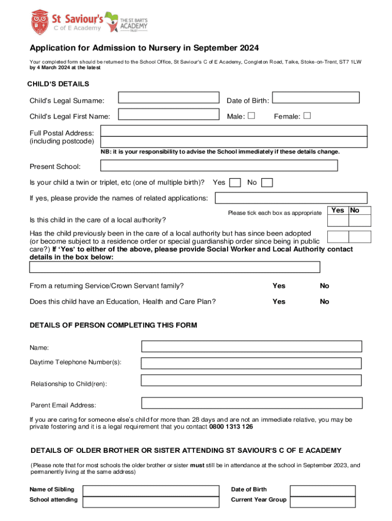 Application for Admission to Nursery in September 2024 Your completed form should be returned to the School Office, St Saviours C of E Academy, Congleton Road, Talke, StokeonTrent, ST7 1LW by 4 March 2024 at the latestCHILDS DETAILS Childs Legal Surname:Date of Birth:Childs Legal First Name:Male:Female:Full Postal Address: (including postcode) NB: it is your responsibility to advise the School immediately if these details change.Present School: Is your child