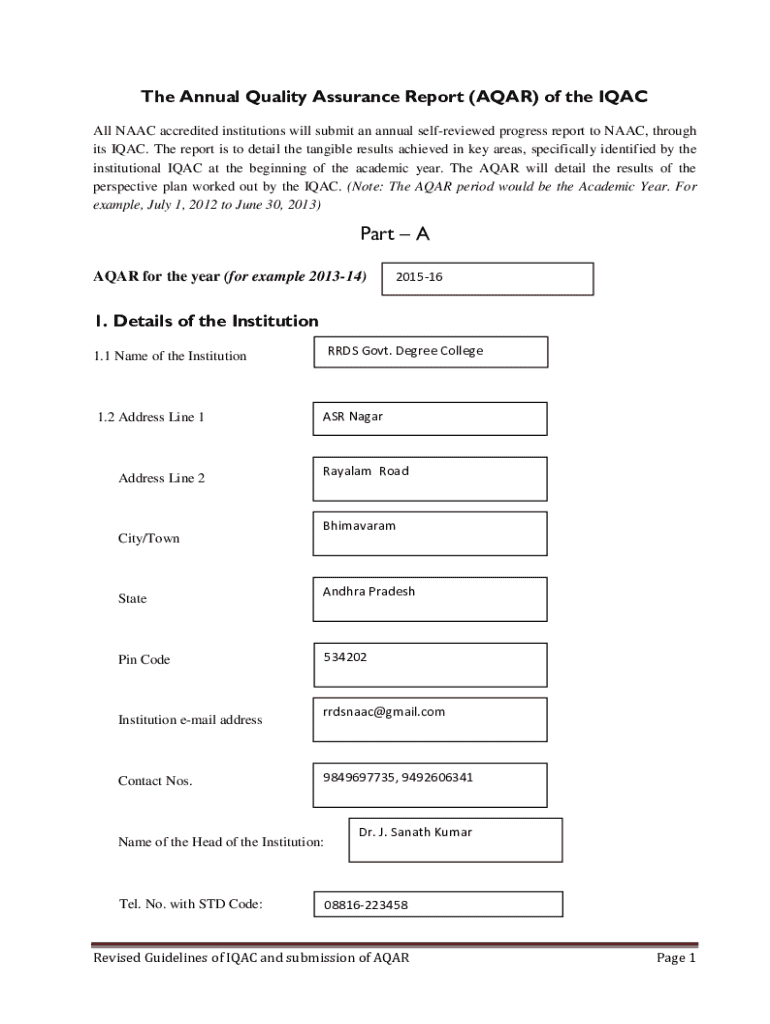 The Annual Quality Assurance Report (AQAR) of the IQAC All NAAC accredited institutions will submit an annual selfreviewed progress report to NAAC, through its IQAC. The report is to detail the tangible results achieved in key areas, specifically identified by the institutional IQAC at the beginning of the academic year. The AQAR will detail the results of the perspective plan worked out by the IQAC. (Note: The AQAR period would be the Academic Year. For example, July 1, 2012 to June 30,...
