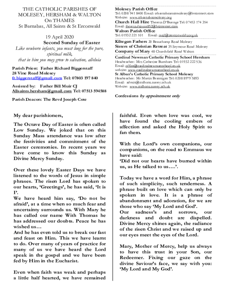 THE CATHOLIC PARISHES OF MOLE SEY, HERSHEY & WALTON On THAMES St Barnabas, All Saints & St Ronald 19 April 2020 Second Sunday of Easter Like newborn infants, you must long for the pure, spiritual