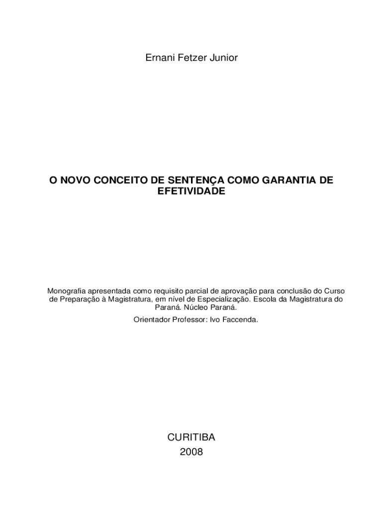 Ernani Fetzer JuniorO NOVO CONCEITO DE SENTENA COMO GARANTIA DE EFETIVIDADEMonografia apresentada como requisito parcial de aprovao para concluso do Curso de Preparao Magistratura, em nvel de Especializao.