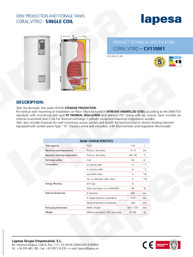 DHW PRODUCTION AND STORAGE TANKSCORAL VITRO SINGLE COIL DwwPRODUCT TECHNICAL SPECIFICATIONCORAL VITRO CV110M1 FCP_028_01_EN A+ A B C D E Fkv HBkr kw/eDESCRIPTION: Tank for domestic hot water (DHW) STORAGEPRODUCTION. For vertical wall mounting or installation on floor. Manufactured in VITREOUS ENAMELLED STEEL according to the DIN4753 standard, with mouldinjected rigid PU THERMAL INSULATION and external PVC lining with zip closure. Tank includes an internal enamelled steel COIL for thermal...