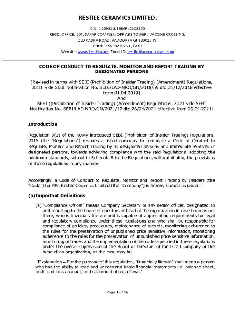 RESTILE CERAMICS LIMITED. CIN : L26931GJ1986PLC102350 REGD. OFFICE: 204, SAKAR COMPLEX, OPP ABS TOWER , VACCINE CROSSING, OLD PADRA ROAD, VADODARA GJ 390015 IN, PHONE: 9998219763 , FAX : Website: www.Restile.com, Email ID: restile@accountscare.comCODE OF CONDUCT TO REGULATE, MONITOR AND REPORT TRADING BY DESIGNATED PERSONS[Revised in terms with SEBI (Prohibition of Insider Trading) (Amendment) Regulations, 2018 vide SEBI Notification No. SEBI/LADNRO/GN/2018/59 dtd 31/12/2018 effective from 01