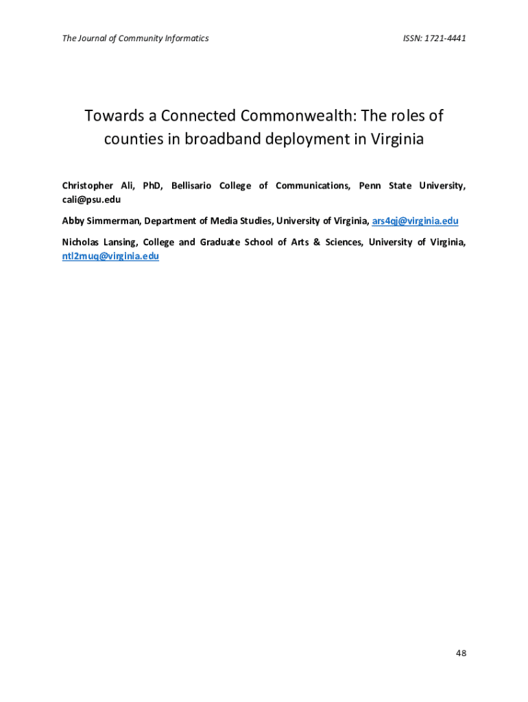 The Journal of Community InformaticsISSN: 17214441Towards a Connected Commonwealth: The roles of counties in broadband deployment in Virginia Christopher Ali, PhD, Bellisario College of Communications, Penn State University, cali@psu.edu Abby Simmerman, Department of Media Studies, University of Virginia, ars4qj@virginia.edu Nicholas Lansing, College and Graduate School of Arts & Sciences, University of Virginia, ntl2muq@virginia.edu48The Journal of Community InformaticsISSN: 17214441Towards