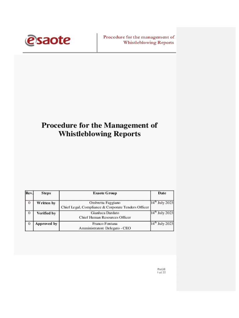 Procedure for the management of Whistleblowing ReportsProcedure for the Management of Whistleblowing ReportsRev.StepsEsaote GroupDate0Written by0Verified byGianluca Dardato Chief Human Resources Officer14th July 20230Approved byFranco Fontana Amministratore Delegato CEO14th July 2023Ombretta Faggiano 14th July 2023 Chief Legal, Compliance & Corporate Tenders OfficerPAGE 1 of 22Procedure for the management of Whistleblowing ReportsSummary 1.Purpose .....