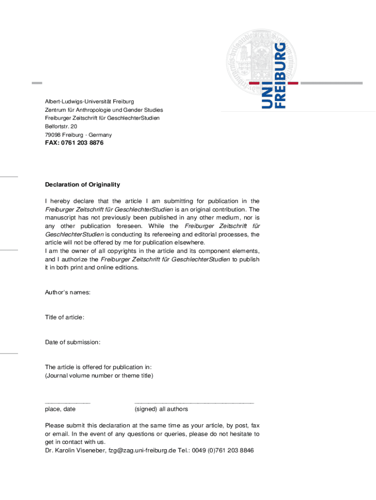 AlbertLudwigsUniversitt Freiburg Zentrum fr Anthropologie und Gender Studies Freiburger Zeitschrift fr GeschlechterStudien Belfortstr. 20 79098 Freiburg GermanyFAX: 0761 203 8876Declaration of Originality I hereby declare that the article I am submitting for publication in the Freiburger Zeitschrift fr GeschlechterStudien is an original contribution. The manuscript has not previously been published in any other medium, nor is any other publication foreseen. While the Freiburger Zeitschrift