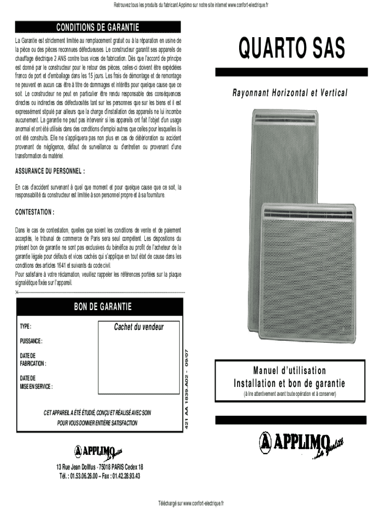 Retrouvez tous les produits du fabricant Applimo sur notre site internet www.confortelectrique.frCONDITIONS DE G ARANTIE La Garantie est strictement limite au remplacement gratuit ou la rparation