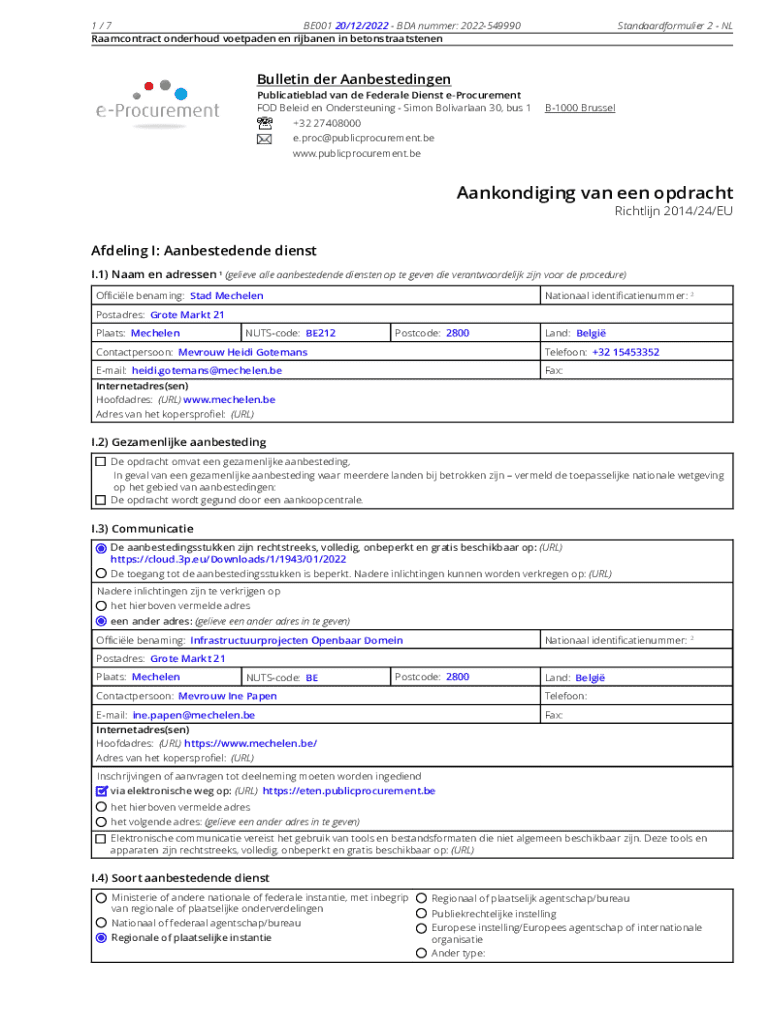1/7 BE001 20/12/2022 BDA nummer: 2022549990 Raamcontract onderhoud voetpaden en rijbanen in betonstraatstenenStandaardformulier 2 NLBulletin der Aanbestedingen Publicatieblad van de Federale Dienst