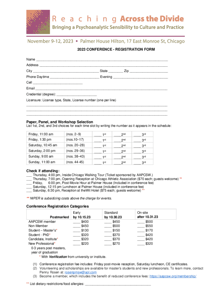 To participate in the 2023 conference, it's essential to complete the registration process. This starts with accessing the registration form, which is conveniently available on the pdfFiller platform. Simply navigate to the registration section and locate the form designed specifically for the conference.
