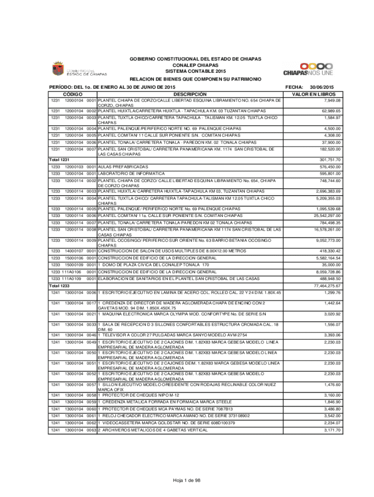 GOVERNOR CONSTITUTIONAL DEL ESTATE DE CHIAPAS CONLEY CHIAPAS SYSTEM CONSTABLE 2015 RELATION DE LINES QUE COMPONENT SU PATRIMONY PERIOD: DEL 1o. DE NERO AL 30 DE JUNIOR DE 2015 CDI GO 1231 1231 1231DESCRIPCIN12000104