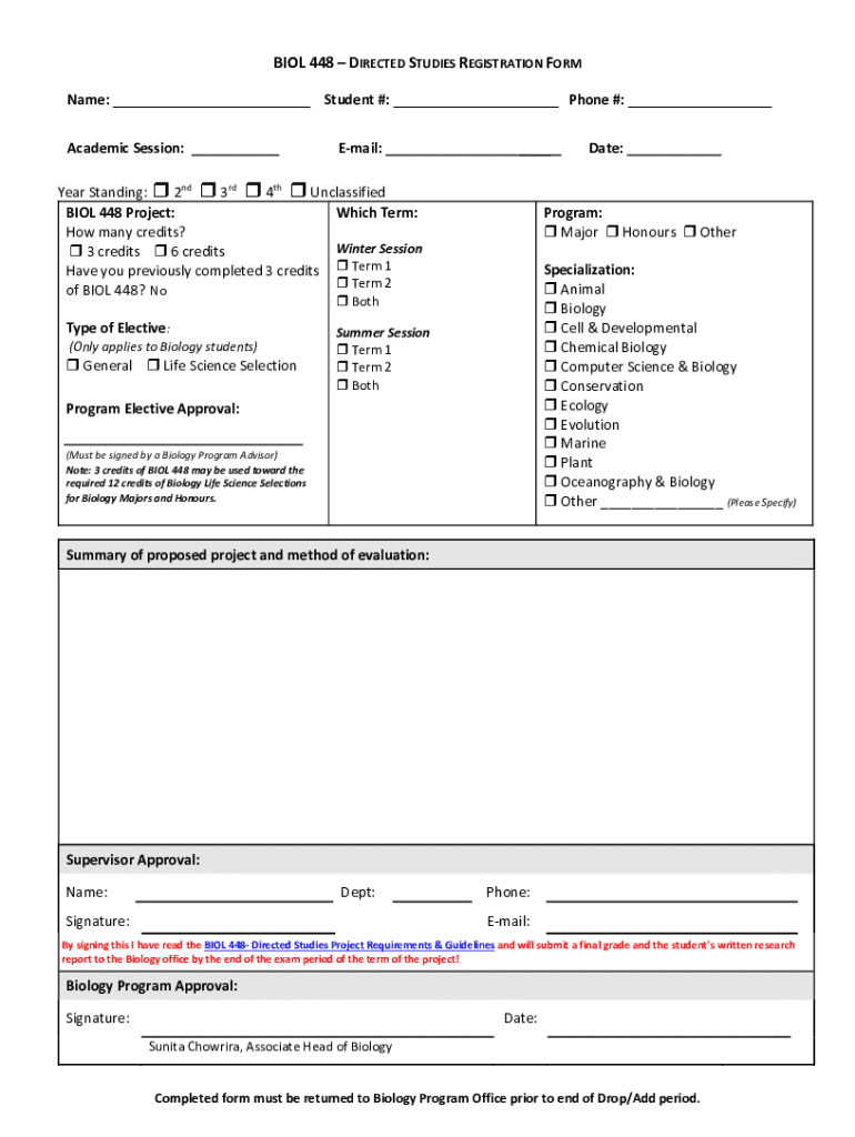 The Biol 448 directed studies form is a critical document that outlines a student’s proposed research project and secures the necessary approvals for enrollment in the course. Its primary purpose is to communicate the student’s objectives and design for their directed study to faculty members while ensuring that the proposal aligns with academic policies.
