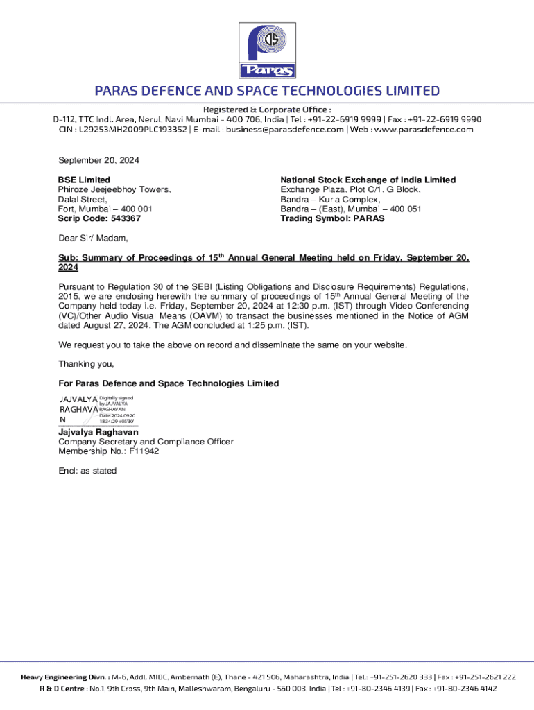 September 20, 2024, BSE Limited Phone Jeejeebhoy Towers, Daley Street, Fort, Mumbai 400 001 Scrip Code: 543367National Stock Exchange of India Limited Exchange Plaza, Plot C/1, G Block, Sandra Karla