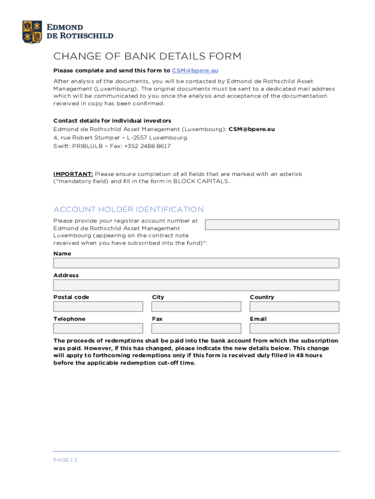 CHANGE OF BANK DETAILS FORM LEVEL OF CONFIDENTIALITYEDMOND DE ROTHSCHILD, BOLD BUILDERS OF THE FUTURE.CHANGE OF BANK DETAILS FORM Please complete and send this form to CSM@bpere.eu After analysis