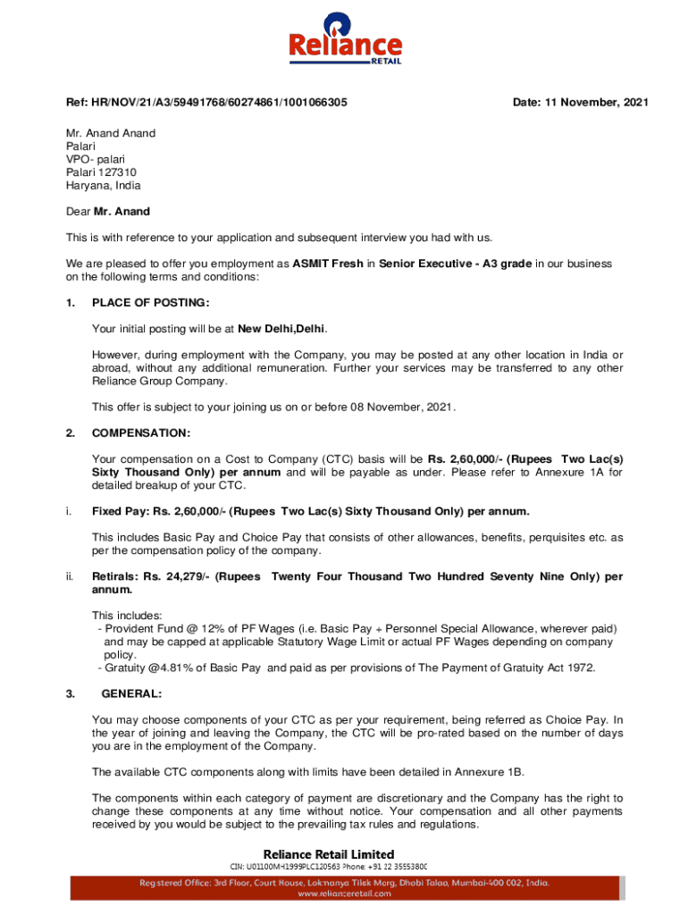 Ref: HR/NOV/21/A3/59491768/60274861/1001066305Date: 11 November, 2021Mr. Anand Anand Palari VPO palari Palari 127310 Haryana, India Dear Mr. Anand This is with reference to your application and subsequent interview you had with us. We are pleased to offer you employment as ASMIT Fresh in Senior Executive A3 grade in our business on the following terms and conditions: 1.PLACE OF POSTING: Your initial posting will be at New Delhi,Delhi. However, during employment with the Company, you may