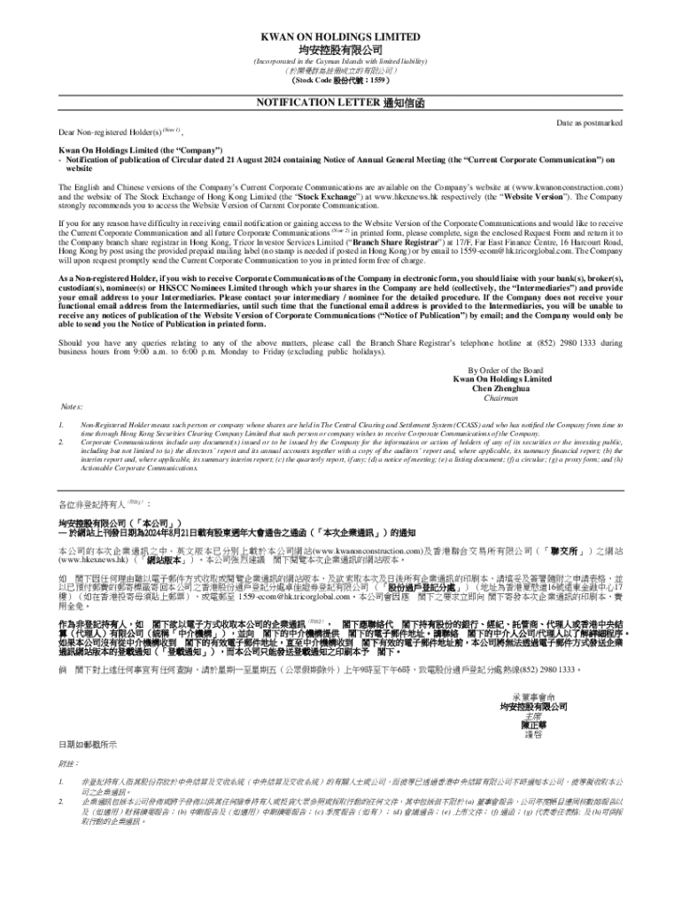 KWAN ON HOLDINGS LIMITED (Incorporated in the Cayman Islands with limited liability) Stock Code 1559NOTIFICATION LETTER Date as postmarked Dear Nonregistered Holder(s) (Note 1), Kwan On Holdings Limited