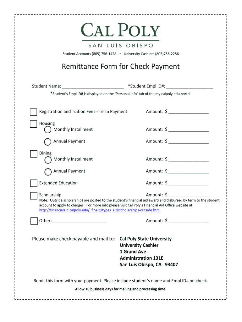 Student Accounts (805) 756?1428 University Cashiers (805)756?2256 Remittance Form for Check Payment Student Name: *Student Emil ID#: *Student s Emil ID# is displayed on the Personal Info tab of the.cal