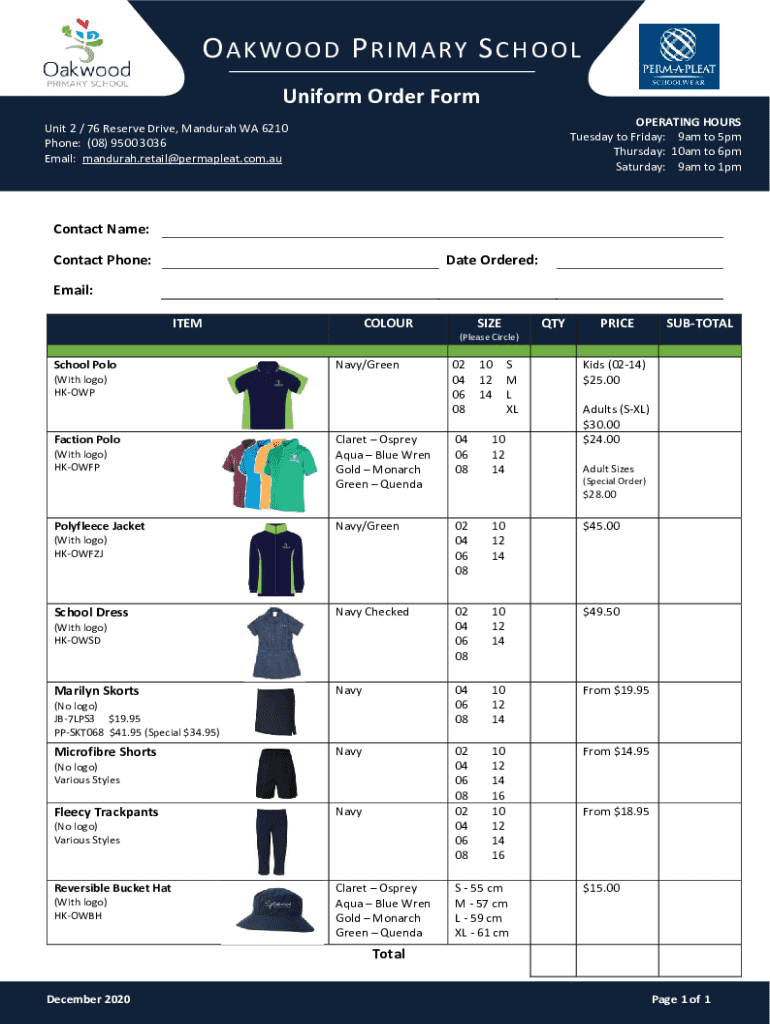 Get the free Uniform Order Form - Oakwood Primary School
