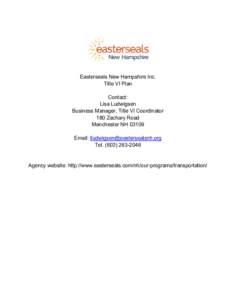 Easterseals New Hampshire Inc. Title VI Plan Contact: Lisa Ludwig sen Business Manager, Title VI Coordinator 180 Zachary Road Manchester NH 03109 Email: lludwigsen@eastersealsnh.org Tel. (603) 2632046