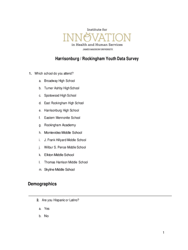 Harrisonburg / Rockingham Youth Data Survey 1. Which school do you attend? a. Broadway High School b. Turner Ashby High School c. Spotswood High School d. East Rockingham High School e. Harrisonburg High School f.Eastern Mennonite Schoolg. Rockingham Academy h. Montevideo Middle School i.J. Frank Hillyard Middle Schoolj.Wilbur S. Pence Middle Schoolk. Elkton Middle School l.Thomas Harrison Middle Schoolm. Skyline Middle SchoolDemographics2. Are you Hispanic or Latino? a. Yes b