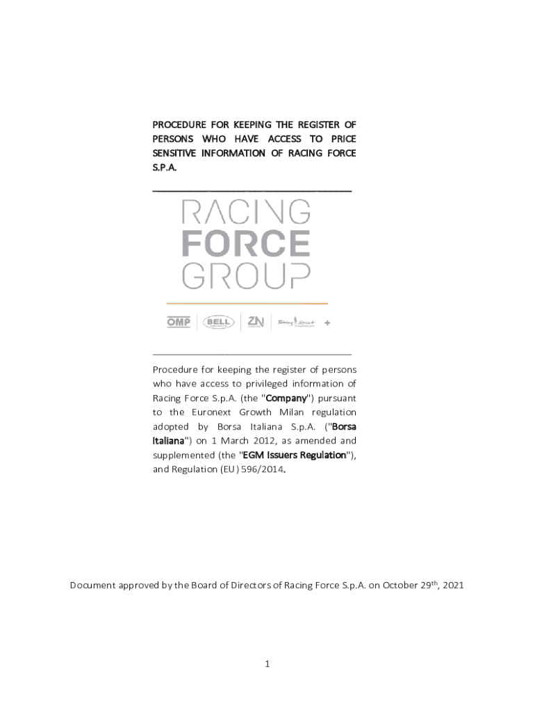 PROCEDURE FOR KEEPING THE REGISTER OF PERSONS WHO HAVE ACCESS TO PRICE SENSITIVE INFORMATION OF RACING FORCE S.P.A. ______ Procedure for keeping the register of persons who have access to privileged