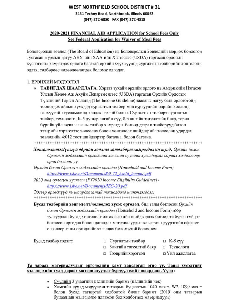 WEST NORTHFIELD SCHOOL DISTRICT # 31 3131 Techny Road, Northbrook, Illinois 60062 (847) 2726880 FAX (847) 272481820202021 FINANCIAL AID APPLICATION for School Fees Only See Federal Application for