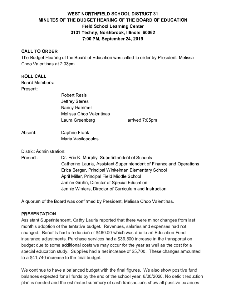 WEST NORTHFIELD SCHOOL DISTRICT 31 MINUTES OF THE BUDGET HEARING OF THE BOARD OF EDUCATION Field School Learning Center 3131 Techny, Northbrook, Illinois 60062 7:00 PM, September 24, 2019 CALL TO