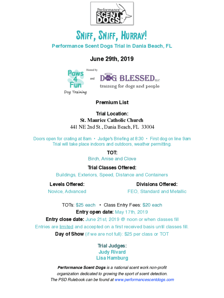 Sniff, Sniff, Hurray! Performance Scent Dogs Trial in Dania Beach, FLJune 29th, 2019Premium List Trial Location:St. Maurice Catholic Church 441 NE 2nd St., Dania Beach, FL 33004 Doors open for crating at 8am Judge\'s Briefing at 8:30 First dog on line 9am Trial will take place indoors and outdoors, weather permitting.TOT: Birch, Anise and Clove Trial Classes Offered: Buildings, Exteriors, Speed, Distance and Containers Levels Offered: Novice, AdvancedDivisions Offered: FEO, Standard